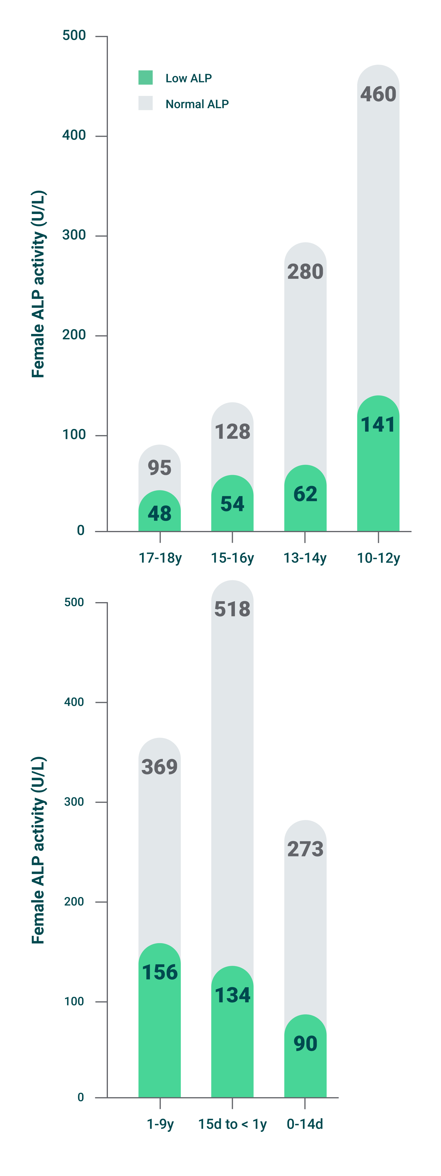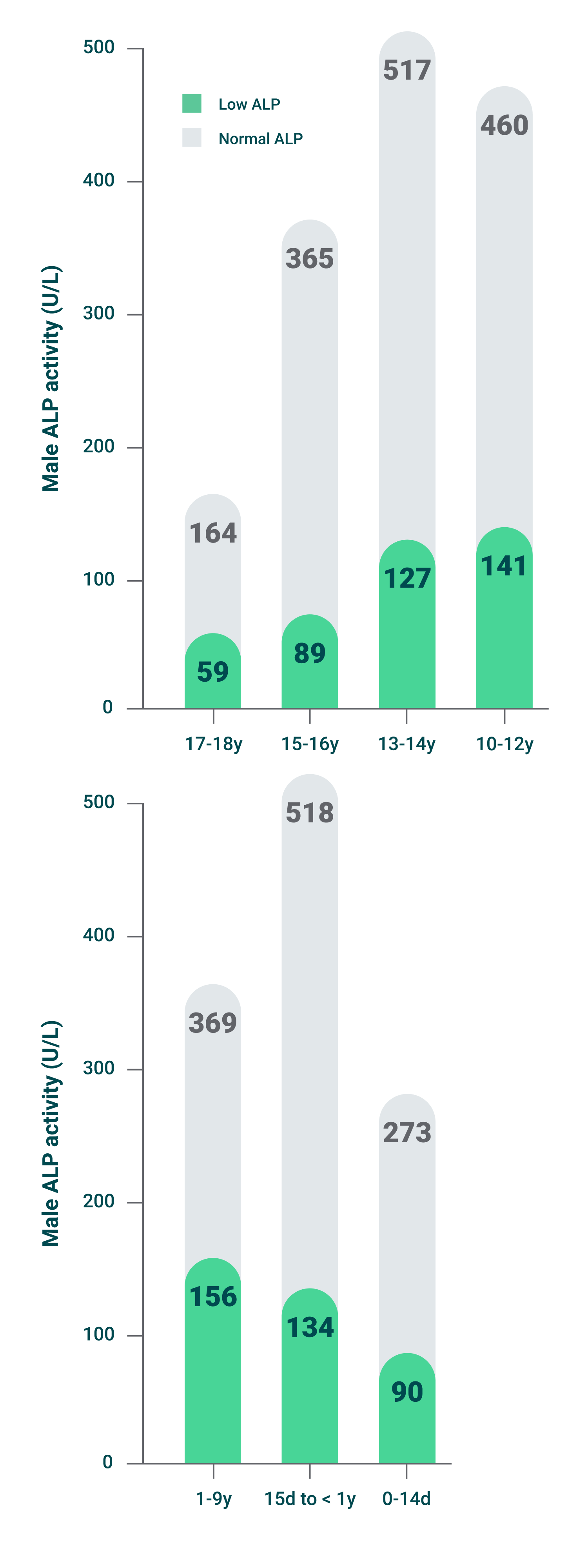 References: 1. Rockman-Greenberg C. Hypophosphatasia. Pediatr Endocrinol Rev. 2013;10(suppl 2):380-388. 2. Hӧgler W, Langman C, Gomes da Silva H, et al. Diagnostic delay is common among patients with hypophosphatasia: initial findings from a longitudinal, prospective, global registry. BMC Musculoskelet Disord. 2019;20(1):80. 3. Seefried L, Dahir K, Petryk A, et al. Burden of illness in adults with hypophosphatasia: data from the Global Hypophosphatasia Patient Registry. J Bone Miner Res. 2020;35(11):2171-2178. 4. Weber TJ, Sawyer EK, Moseley S, Odrljin T, Kishnani PS. Burden of disease in adult patients with hypophosphatasia: results from two patient-reported surveys. Metabolism. 2016;65(10):1522-1530. 5. Bianchi ML, Bishop NJ, Guañabens N, et al; Rare Bone Disease Action Group of the European Calcified Tissue Society Hypophosphatasia in adolescents and adults: overview of diagnosis and treatment. Osteoporos Int. 2020;31(8):1445-1460. 6. McKiernan FE, Berg RL, Fuehrer J. Clinical and radiographic findings in adults with persistent hypophosphatasemia. J Bone Miner Res. 2014;29(7):1651-1660. 7. Vieira LHR, Peixoto KC, Flósi CL, de Farias MLF, Madeira M. Active search of adult patients with persistently low serum alkaline phosphatase levels for the diagnosis of hypophosphatasia. Arch Endocrinol Metab. 2021;65(3):289-294. 8. Adeli K, Higgins V, Nieuwesteeg M, et al. Biochemical marker reference values across pediatric, adult, and geriatric ages: establishment of robust pediatric and adult reference intervals on the basis of the Canadian Health Measures Survey. Clin Chem. 2015;61(8):1049-1062. 9. Schumann G, Klauke R, Canalias F, et al. IFCC primary reference procedures for the measurement of catalytic activity concentrations of enzymes at 37°C. Part 9: reference procedure for the measurement of catalytic concentration of alkaline phosphatase. Clin Chem Lab Med. 2011;49(9):1439-1446. 10. Quest Diagnostics. Alkaline phosphatase. Accessed April 3, 2023. https://testdirectory.questdiagnostics.com/test/test-detail/234/alkaline-phosphatase?p=r&q=Alkaline%20Phosphatase&cc=MASTER 11. Labcorp. Alkaline phosphatase. Accessed April 3, 2023. https://www.labcorp.com/tests/001107/alkaline-phosphatase 12. ARUP Laboratories. Alkaline phosphatase isoenzymes, serum or plasma. Accessed April 3, 2023. https://ltd.aruplab.com/Tests/Pub/0021020 13. Colantonio DA, Kyriakopoulou L, Chan MK, et al. Closing the gaps in pediatric laboratory reference intervals: a CALIPER database of 40 biochemical markers in a healthy and multiethnic population of children. Clin Chem. 2012;58(5):854-868. 14. Bishop N, Munns CF, Ozono K. Transformative therapy in hypophosphatasia. Arch Dis Child. 2016;101(6):514-515. 15. Rush ET, Moseley S, Petryk A. Burden of disease in pediatric patients with hypophosphatasia: results from the HPP Impact Patient Survey and the HPP Outcomes Study Telephone interview. Orphanet J Rare Dis. 2019;14(1):201. 16. Pierpont EI, Simmons JH, Spurlock KJ, et al. Impact of pediatric hypophosphatasia on behavioral health and quality of life. Orphanet J Rare Dis. 2021;16(1):80. 17. Kishnani PS, Rush ET, Arundel P, et al. Monitoring guidance for patients with hypophosphatasia treated with asfotase alfa. Mol Genet Metab. 2017;122(1-2):4-17. 18. Colazo JM, Hu JR, Dahir KM, et al. Neurological symptoms in hypophosphatasia. Osteoporos Int. 2019;30(2):469-480. 19. Fallon MD, Teitelbaum SL, Weinstein R, et al. Hypophosphatasia: clinicopathologic comparison of the infantile, childhood, and adult forms. Medicine (Baltimore). 1984;63(1):12-24. 20. Whyte MP, Leung E, Wilcox WR, et al. Natural history of perinatal and infantile hypophosphatasia: a retrospective study. J Pediatr. 2019;209:116-124.e4. 21. NORD. Hypophosphatasia. Accessed March 30, 2023. https://rarediseases.org/rare-diseases/hypophosphatasia/ 22. Mornet E, Nunes ME. Hypophosphatasia. In: Adam MP, Ardinger HH, Pagon RA, et al, eds. GeneReviews®. University of Washington; 2007. Accessed March 30, 2023. https://www.ncbi.nlm.nih.gov/books/NBK1150/ 23. Whyte MP. Hypophosphatasia: nature’s window on alkaline phosphatase function in humans. In: Bilezikian JP, Raisz LG, Martin TJ, eds. Principles of Bone Biology. 3rd ed. Academic Press; 2008:1573-1598. 24. Baumgartner-Sigl S, Haberlandt E, Mumm S, et al. Pyridoxine-responsive seizures as the first symptom of infantile hypophosphatasia caused by two novel missense mutations (c.677T>C, p.M226T; c.1112C>T, p.T371I) of the tissue-nonspecific alkaline phosphatase gene. Bone. 2007;40(6):1655-1661. 25. Eade AW, Swannell AJ, Williamson N. Pyrophosphate arthropathy in hypophosphatasia. Ann Rheum Dis. 1981;40(2):164-170. 26. Braunstein NA. Multiple fractures, pain, and severe disability in a patient with adult-onset hypophosphatasia. Bone Rep. 2015;4:1-4. 27. Salles JP. Hypophosphatasia: biological and clinical aspects, avenues for therapy. Clin Biochem Rev. 2020;41(1):13-27. 28. Conti F, Ciullini L, Pugliese G. Hypophosphatasia: clinical manifestation and burden of disease in adult patients. Clin Cases Miner Bone Metab. 2017;14(2):230-234. 29. Whyte M, Leung E, Wilcox W, et al. Hypophosphatasia: a retrospective natural history study of the severe perinatal and infantile forms. Poster presented at: Pediatric Academic Societies and Asian Society for Pediatric Research Joint Meeting; May 3-6, 2014; Vancouver, BC, Canada. 30. Nunes ME. Hypophosphatasia. 2007 Nov 20 [Updated 2023 Mar 30]. In Adam P, Mirzaa GM, Pagon RA, et al, eds. GeneReviews® [Internet]. Seattle (WA): University of Washington, Seattle; 1993-2023. Accessed March 30, 2023. http://www.ncbi.nlm.nih.gov/books/NBK1150/? 31. Mohn A, De Leonibus C, de Giorgis T, Mornet E, Chiarelli F. Hypophosphatasia in a child with widened anterior fontanelle: lessons learned from late diagnosis and incorrect treatment. Acta Paediatr. 2011;100(7):e43-e46. 32. Sutton RAL, Mumm S, Coburn SP, Ericson KL, Whyte MP. “Atypical femoral fractures” during bisphosphonate exposure in ad